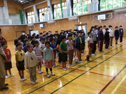 6月の全校集会を行いました。校長先生から3冊の本の紹介がありました。また、学習担当の先生から「授業のレベルを上げよう」と題して、スピーチや授業で話を聞くときに大切にしている「うめライス」の話がありました。ご家庭でも話題にしていただけると嬉しいです。最後に、校歌を元気よく歌いました。