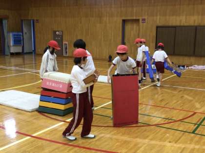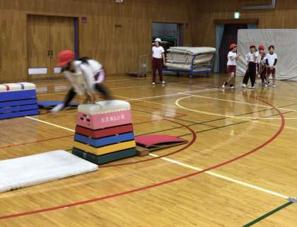 跳び箱運動をしていました。途中で段の高さを調節しながら元気に跳んでいました。終了後は、みんなで協力して片付けていました。