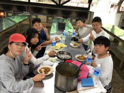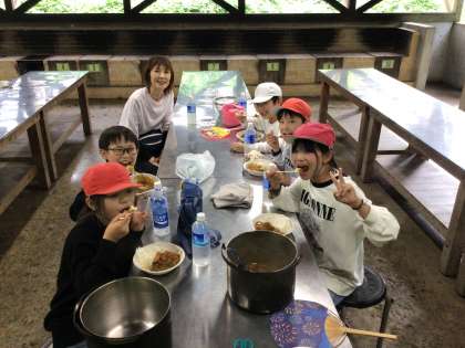 5年生 野外学習 夕食 公開日 2025/06/11 更新日 2025/06/11 お知らせ どの班のカレーライスも上手に出来上がり、みんな笑顔で、大変美味しそうに食べていました。自分たちで作り、外で食べるカレーライスは最高ですね。