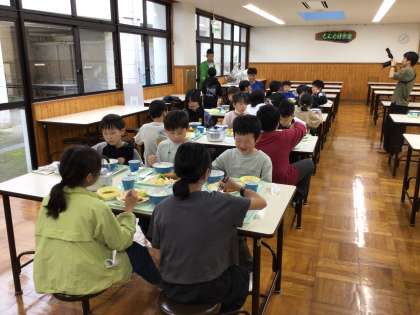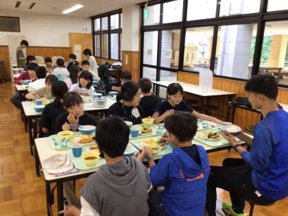 朝食は、どんぐり食堂で食べました。食事係が上手に盛り付けをしました。みんなもりもり食べていました。