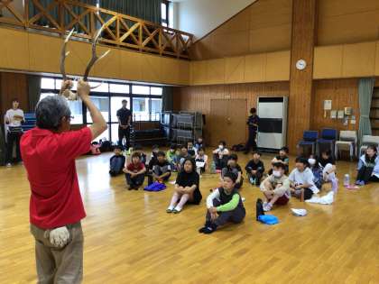 野外センターの方の話を聞き、鹿の角も見せていただきました。児童代表の言葉もしっかり聞くことができました。