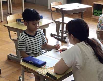 あすくす学級の算数の授業の様子です。 個別に教えてもらいながら、熱心に問題を解いていました。