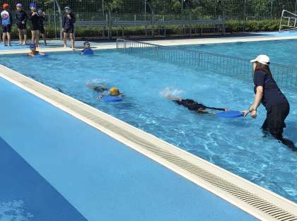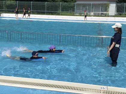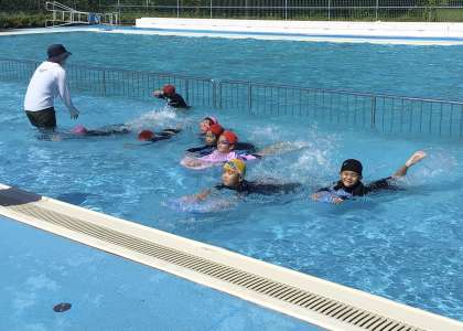 イルカコースとメダカコースに分かれ、ビート板を使いながら練習していました。少しずつ難しいことに挑戦し、先生に褒められたり励まさせたりしながら上達していく様子が見られました。