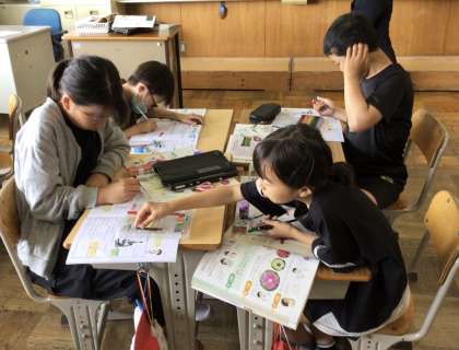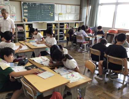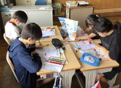 花のつくりを調べるために、アサガオの花をじっくり観察し、理科ノートに描いていました。