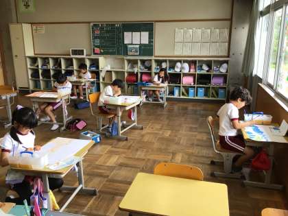 2年生 図工 公開日 2025/07/08 更新日 2025/07/08 お知らせ 2年生の図工の授業の様子です。 先日鉛筆で描いた「夏の絵」の色塗りをしていました。絵の具に水をしっかり含ませて薄く塗ったり、水を少なくし、かすれるように塗って砂浜を表したりと、それぞれ工夫して描いていました。