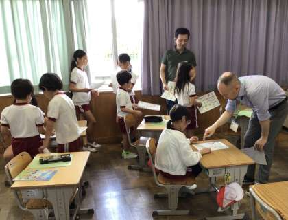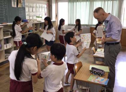 「Do you like ~?」と言いながら、プリントに書いてあるものについて、好きかどうか友だちに尋ねたり、それにこたえたりする活動をしていました。友だちやブライアン先生と楽しそうに関わりながら外国語に親しむ姿が見られました。