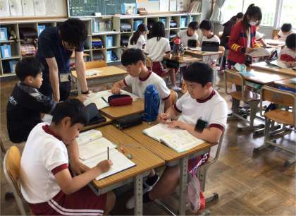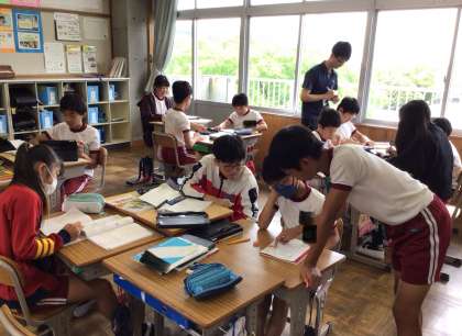 6年生の算数の授業の様子です。 自分で考えた後、グループで話し合い、説明したり教えたりする姿が見られました。