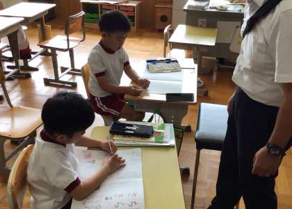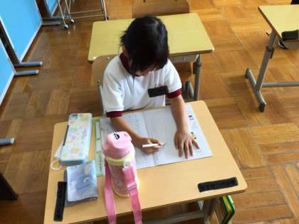 算数では、じっくり考えて問題を解いていました。先生に1つ1つ丸をつけてもらうことで自信をもって次の問題も頑張る姿が見られました。書き方では、鉛筆を正しく持って字を書こうと頑張っていました。