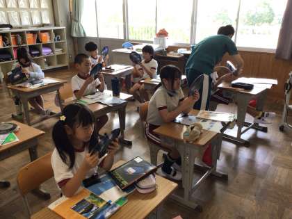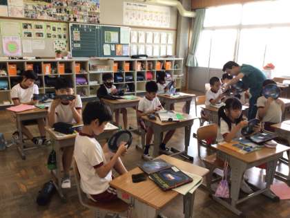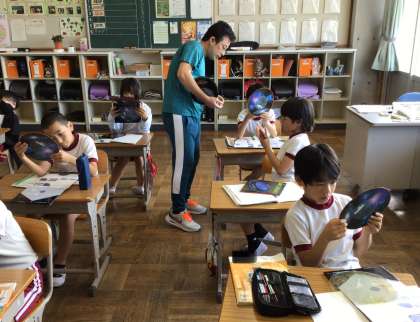 「星座早見盤」の使い方を学習し、実際に動かしていました。日付と時刻を合わせ、方角も確認しながら使います。難しそうでしたが、先生に教えてもらいながら、使い方をマスターしようと頑張っていました。これで、見たい星座を実際に見つけることができるよよいですね。