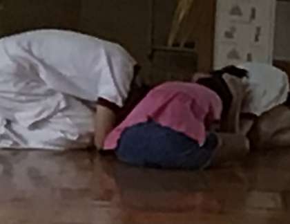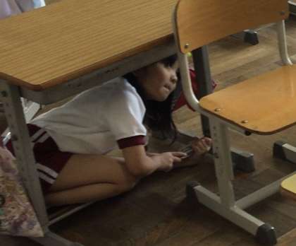 掃除が終わった後の休み時間で、教師がいない場所にいた児童も、自ら机の下にもぐったり、シェイクアウトの姿勢(姿勢を低く、頭を守り、じっとする)をしたりすることができました。高学年が低学年の子の手をひいて避難する姿も見られました。今日の自分の行動を振り返り、いざという時に素早く安全に避難できるようになってほしいと思います。