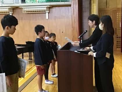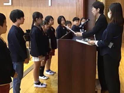 学期区切り式が終わった後、後期の学級委員と委員長の認証を行いました。認証状を受け取るとき、みんなきりっと引き締まった顔をしていました。その後、豊田市学校体育表彰、読書感想文・作文・詩の表彰を行いました。受け取るときに緊張しつつも、嬉しそうでした。