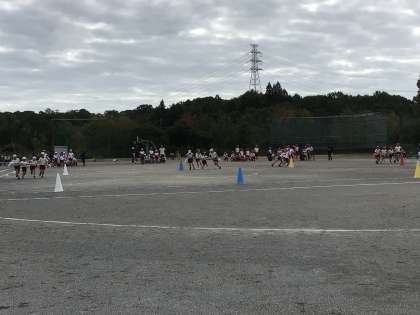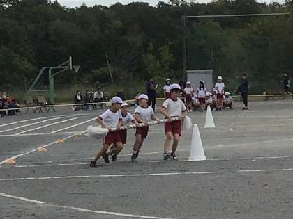 はじめの種目は、台風の目でした。走る速さを4人で合わせたり、コーンを回るときには力加減を調節したりするなど、赤白どちらのチームも協力してゴールを目指して全力で駆け抜けていました。