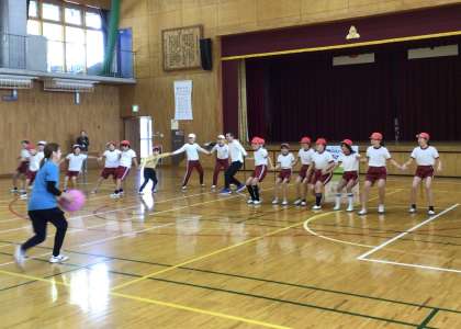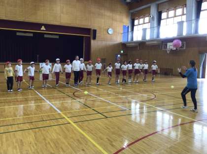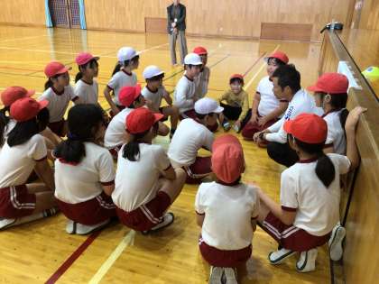 はじめは、体育館で笹井選手と子どもたちでボールを使ったゲームをしました。上に投げたボールが浮かんでいる間だけ、全員が手を繋いで前に進み、ゴールを目指すゲームです。フェイントで投げていない時に動いてしまったり、手を離してしまったりするとまた最初からやり直しです。最初は全く上手くいきませんでしたが、全員で作戦を立て、一歩ずつ確実に進むようにすることで上手になり、最後にはゴールすることができました。「ドンマイドンマイ」「一歩」「一歩」とみんなで声を掛け合い、心を一つにしていく姿が見られました。