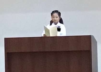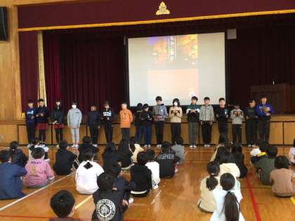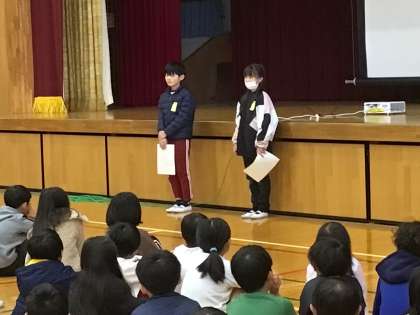 全校集会を行いました。「校長先生のお話」では、人権についての話がありましたが、みんなしっかり前を向いてよい姿勢で聞くことができていました。代表委員会からは、「赤い羽根共同募金」への協力の呼びかけがありました。その後、市に応募した詩が特選に入った児童が、その詩の朗読をしました。大変上手に朗読することができました。校歌を元気に歌った後、最後に、6年生から、石っ子学習で調べた地域のお祭りである「紅葉まつり」の紹介がありました。