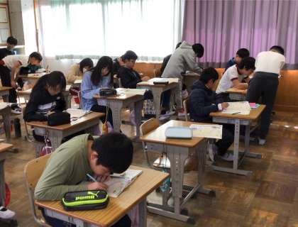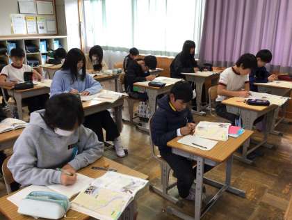 「図形の拡大・縮小」の授業でした。地図の縮図の実際の長さを求めていました。問題を解き終わり先生に丸をつけてもらうと、友だちに教える姿も見られました。