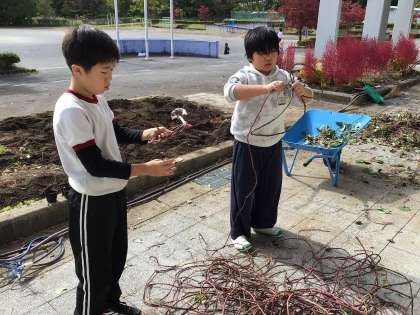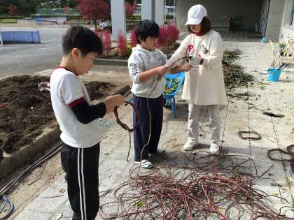 あすくす リース作り 公開日 2025/11/04 更新日 2025/11/04 お知らせ さつまいものツルを使ってリース作りをしていました。ツルが柔らかいうちに丸くしていく必要があります。先生に教えてもらいながら、真剣な表情で大変上手に作っていました。
