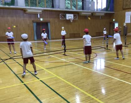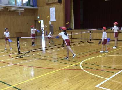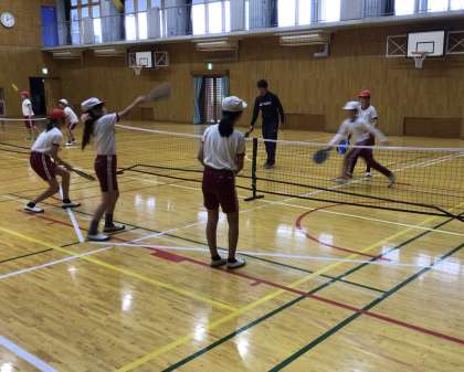 5年生 ピックルボール 公開日 2025/11/05 更新日 2025/11/05 お知らせ 5年生も講師の方にピックルボールを教えていただきました。ピックルボールのボールはプラスチックで多数の穴があいています。適度に弾み、ラケットも短いので打ちやすく、小学生でもテニス型のスポーツを楽しむことができます。今後も体育で少しずつ取り組んでいきます。様々なスポーツに親しみ、体を動かす楽しさを感じてほしいと思います。