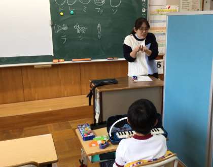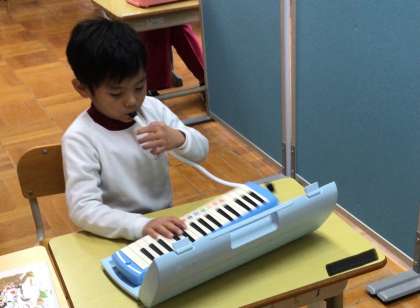 あすくす 音楽 公開日 2025/11/05 更新日 2025/11/05 お知らせ 「どんぐりさんのおうち」という曲に合わせて、選んだ音を3回出す練習をしていました。「ド・ド・ドー」とリズムよく演奏できるよう頑張っていました。