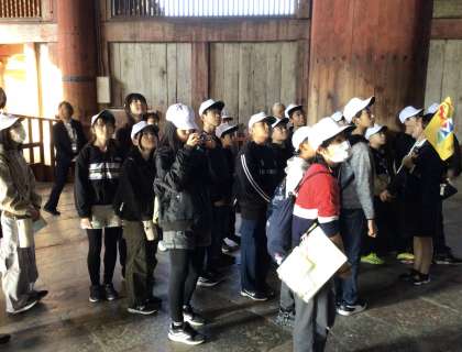 6年生 修学旅行 東大寺 公開日 2025/11/08 更新日 2025/11/08 お知らせ 奈良公園に到着し、東大寺を見学しました。 大きな大仏を下から眺め、ガイドさんの説明を聞き、感動する姿が見られました。