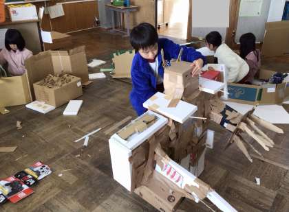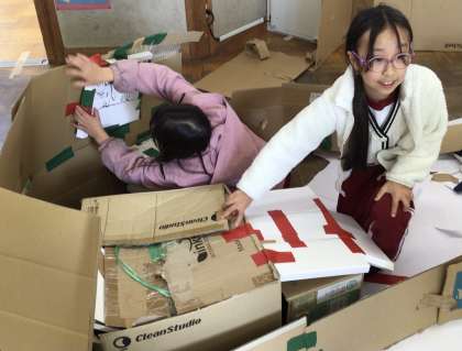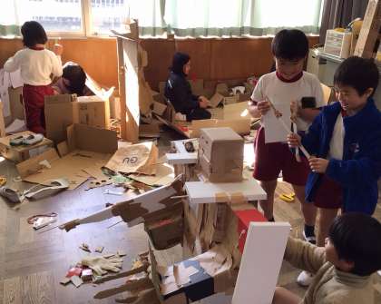 3年生 図工 公開日 2025/11/28 更新日 2025/11/28 お知らせ 段ボールで大きなロボットや家などを作っていました。友達と協力し合って工夫し、生き生きとした表情で活動していました。作った後は作品を紹介したり、友達が作った段ボールの部屋の中で遊んだりする姿も見られました。