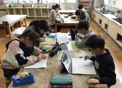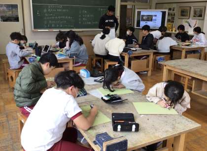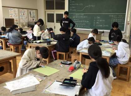 5年生 図工 公開日 2025/12/03 更新日 2025/12/03 お知らせ 木版画に取り組んでいました。 下絵を考え、カーボン紙で写した後、彫刻刀で彫っていました。彫刻刀の使い方も学びましたが、集中すると、ついつい彫刻刀の前に手を置きそうになってしまうため、注意して彫り進める姿が見られました。