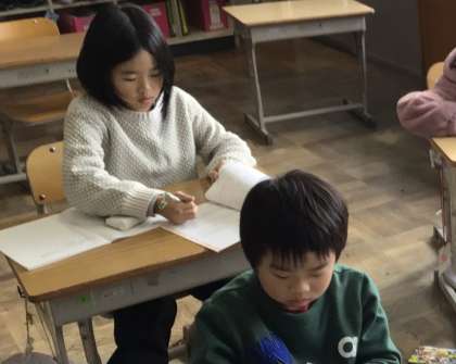 分数の学習をしていました。分数の大きさの比べ方を学び、練習問題を解いて、先生に丸をつけてもらっていました。
