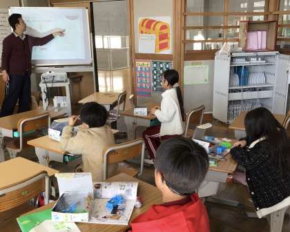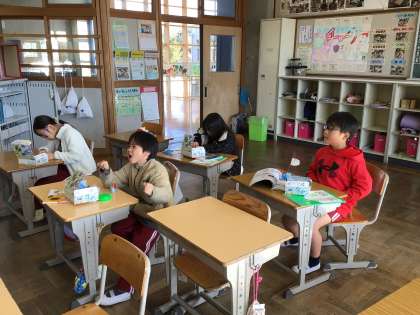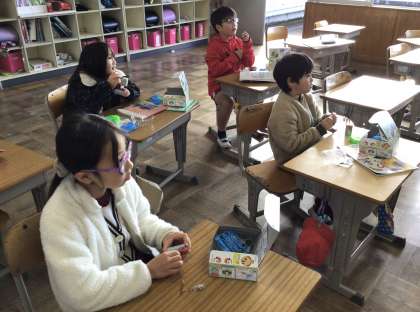 「電気の通り道」の授業でした。どんな時に豆電球がつくのか、いろいろな方法で試していました。豆電球がつくと嬉しそうでした。