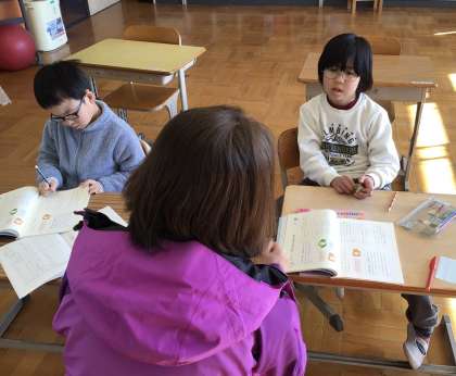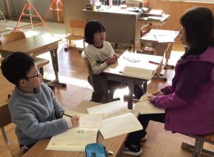 人物の気持ちを表す言葉について考えていました。悲しい時に「かなしい」というのではなく、他にどんな表し方があるのか、先生と一緒に考えていました。