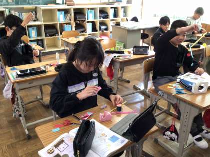 「てこのはたらき」の授業で、つり合いを利用した「モビール」を作っていました。なかなかつり合わず苦労していましたが、支店の位置をずらしてつり合わせようとするなど、頑張っていました。
