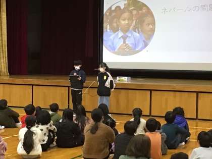 募金の呼びかけでは、冬休み明けに行う「お年玉募金」に協力してもらえるように、代表委員から募金をした後どのようなことに使われるのか、どのように募金を行うかなどの話がありました。