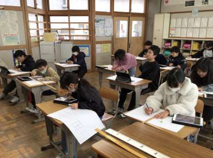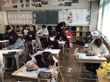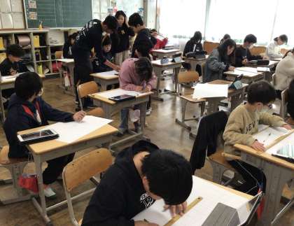 5年生 図工 公開日 2026/01/20 更新日 2026/01/20 お知らせ 風景画を描くために、下書きをしていました。自分が撮った学校の廊下や校舎などの写真を見ながら、奥に行くほど小さくなるように構造物の線引き、遠近感のある構図を考えて下書きしていました。下書きの後は、遠くの風景の色を薄く塗るなどしてさらに遠近感のある絵に仕上げていくようです。どんな絵が完成するか楽しみです。