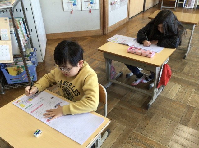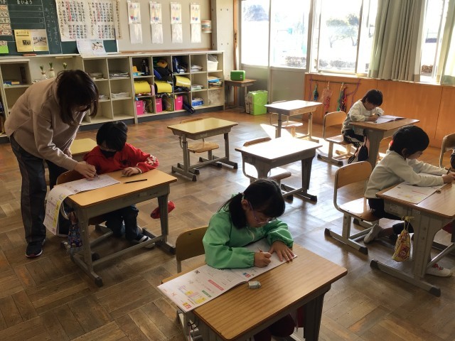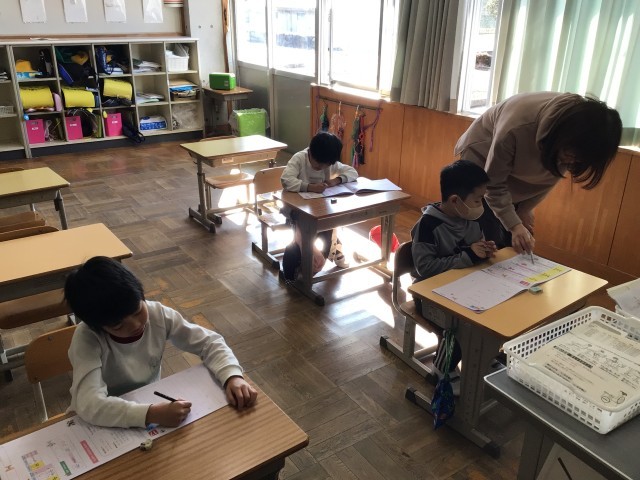 漢字を書いていました。書き終わると先生に丸をつけてもらっていました。みんな真剣な表情で書いていました。