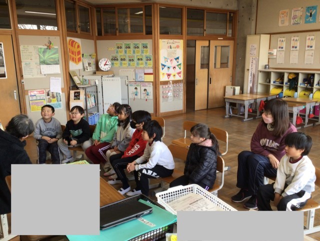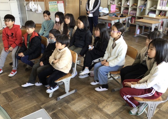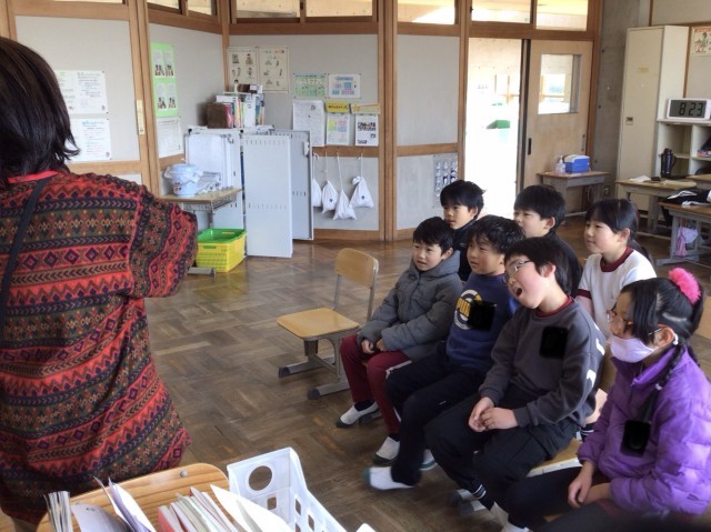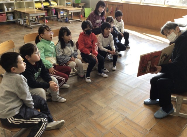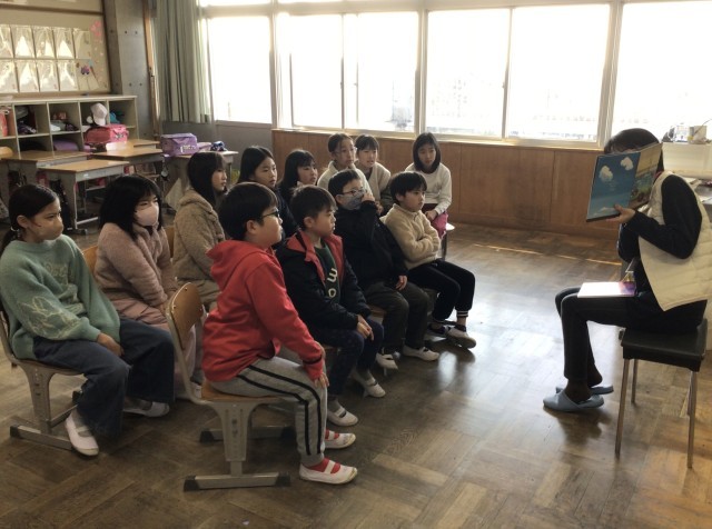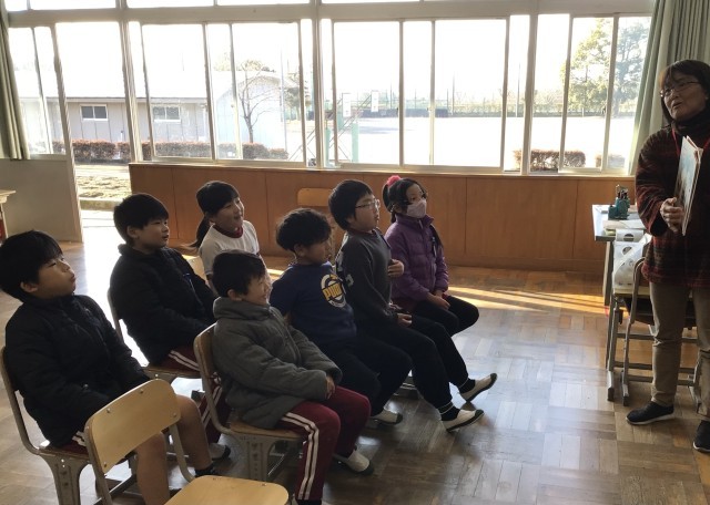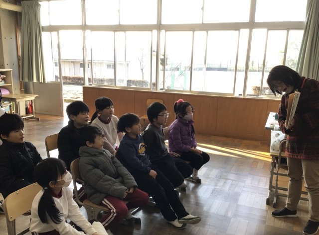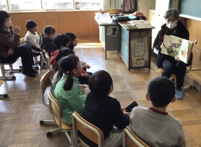 1年生は「じごくのそうべい」2年生は「もくもくやかん」「ウラパン・オコサ」「ねこはるすばん」「ひみつのさくせん」3年生は「たいせつなこと」「春はあけぼの」を読んでいただきました。