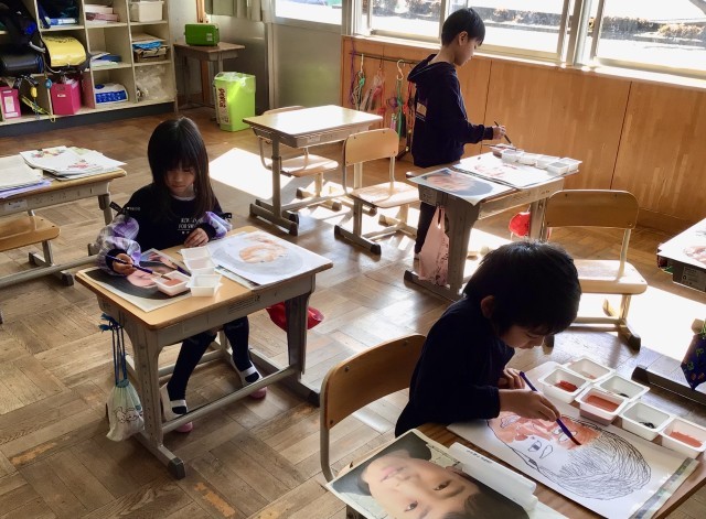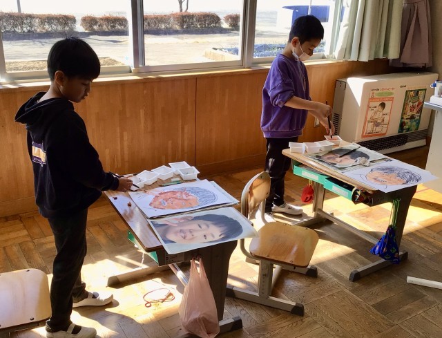自分の似顔絵は完成し、6年生にプレゼントする似顔絵の色塗りをしていました。6年生に喜んでもらうために、みんな頑張っていました。