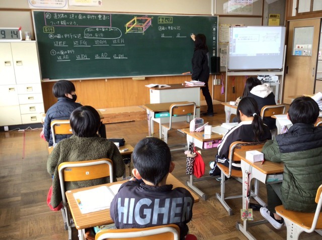 直方体の面と辺の垂直と平行について調べていました。実際に作成した箱を見ながら考える姿が見られました。