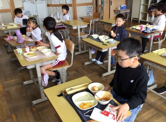 今日はポークビーンズ、フレンチサラダ、ツイストパン、ミックスフルーツ、牛乳でした。楽しくおしゃべりしながらも、もくもくとおいしそうに食べていました。ミックスフルーツが人気で、分け合ってお代わりする姿も見られました。