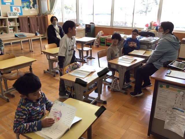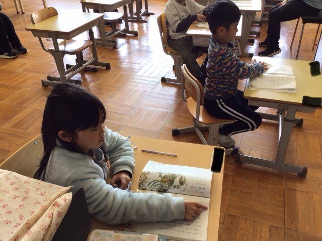 「スイミー」を読んでいました。先生がわざと間違えて読んだ時に、正しい内容を手を挙げて答えていました。大変楽しそうでした。