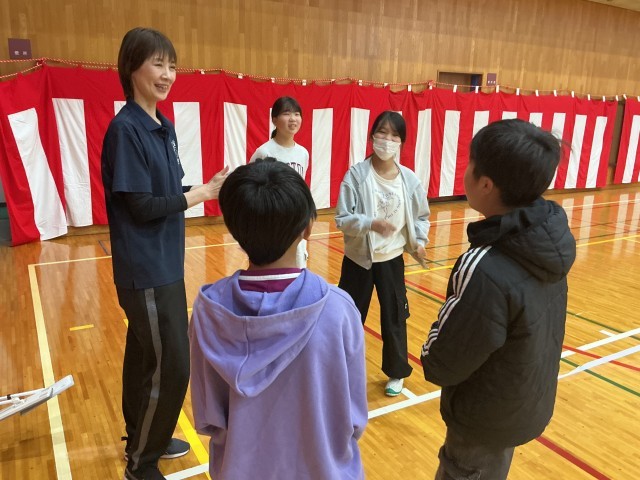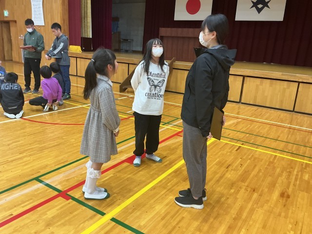 全体説明の中で、「気づき、考え、実行する」を実践するように先生から言われ、うなずきながら話を聞く5・6年生。