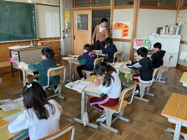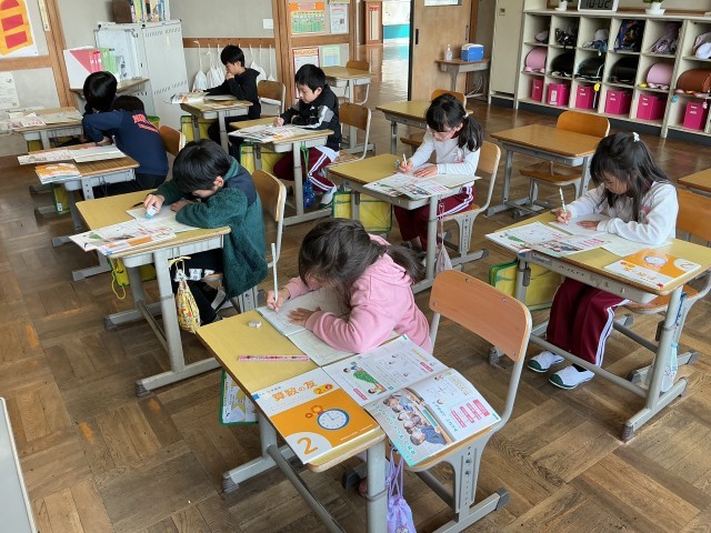 子どもたちも真新しいノートに丁寧な字で、先生の書いたとおりに書きました。