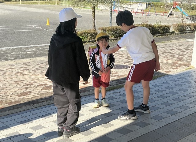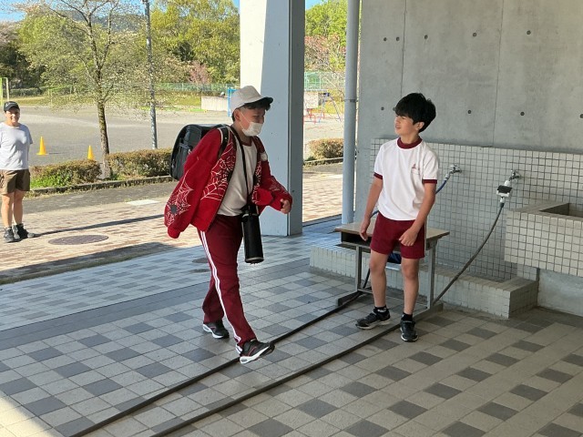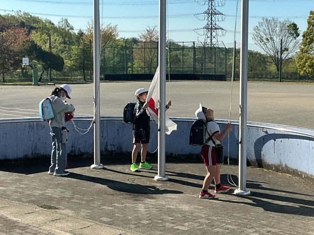 朝から昇降口であいさつ運動をする子、旗を揚げる子。
