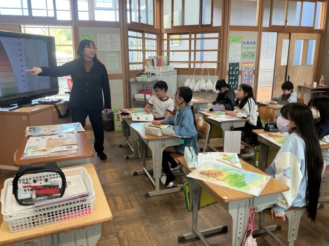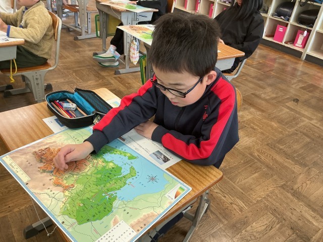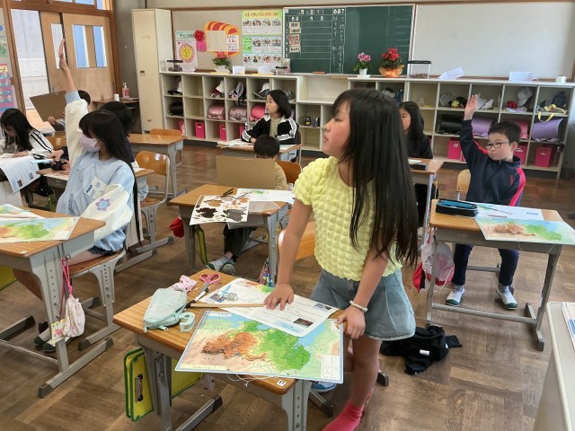 4年生は昨日作成した愛知県の地図を見ながら、「愛知県のプロ」になるため、先生の質問に答えていました。