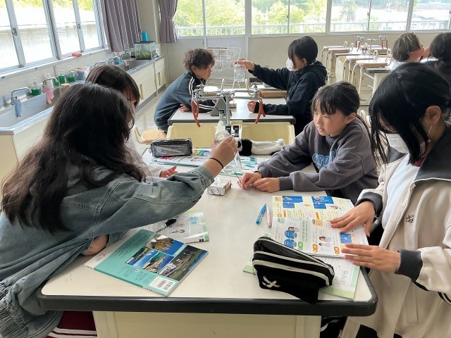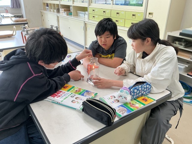 ふたをするとろうそくの火が消えてしまいました。では、「空気が入るようにしたら、ろうそくの火は燃え続けるのだろうか」を実験で調べます。結果は…。6年生に子に聞いてみてください。
