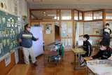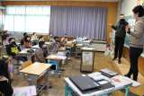 3年生の外国語の授業の様子をお知らせします。担任が黒板に絵を描き、それは何であ...