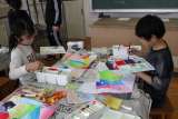 入学を祝う会で4年生がプレゼントを渡す様子です。 4年生が作成した鉛筆立てと首飾...