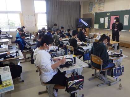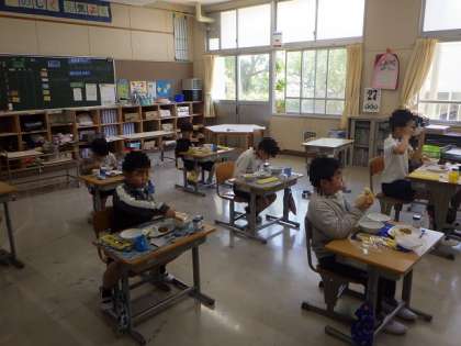 写真左は、書写の時間です。真剣に筆を持ち机に向き合っていました。写真右は給食の様子です。自分たちで準備をして、おいしくいただきました。
