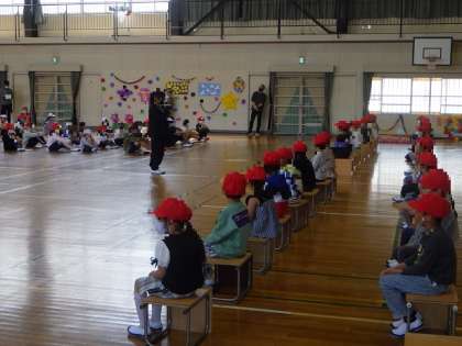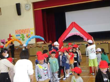 写真左は6年生が司会をしている様子です。中と右は、1年生の入場の様子です。(続きます)