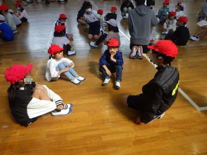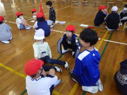 写真左と中はファミリー班で自己紹介をしている様子です。写真右は5年生が先生クイズを出題している様子です。(続きます)