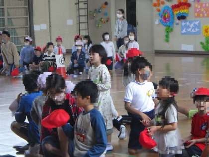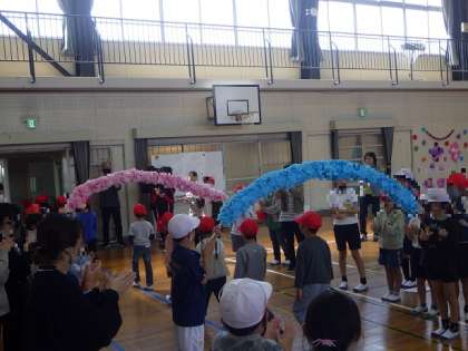 写真左は先生クイズの様子です。写真中は1年生が退場する様子です。写真右は4年生から6年生が片づけをしている様子です。全校児童のおかげで温かい会となりました。