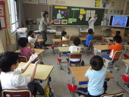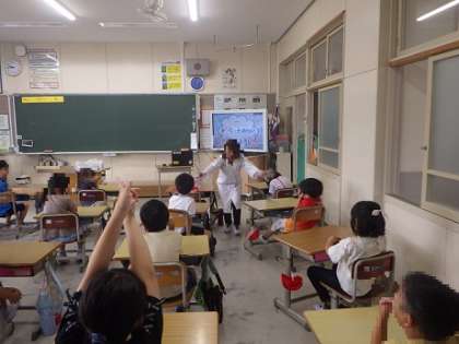授業では、子どもたちに実際に手を洗い、洗い残しを確かめたり、手洗いの歌に合わせて手を洗ったりしました。