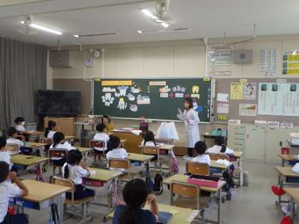 1年生の歯磨き指導の様子をお伝えします。第6臼歯(きゅうし)を確かめたり、磨き残しをしやすい箇所を確かめたりして、実際に歯磨きを丁寧に行いました。